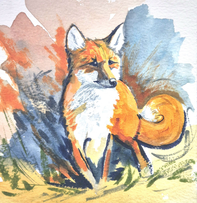Foxy Loxy standing in the undergrowth. Painted in watercolours. The print size is 6''x6'' and its mounted on 8''x8'' white mount board