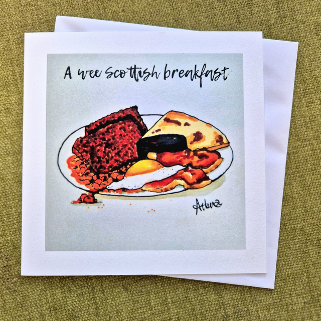 This quirky card shows a traditional Scottish breakfast - different from a Full English, it contains the following fried items: tattie scone, square sausage, beans, bacon, egg and black pudding (preferably Stornoway). Illustrated by Athena McLellan, this card will make you long for this tasty breakfast!